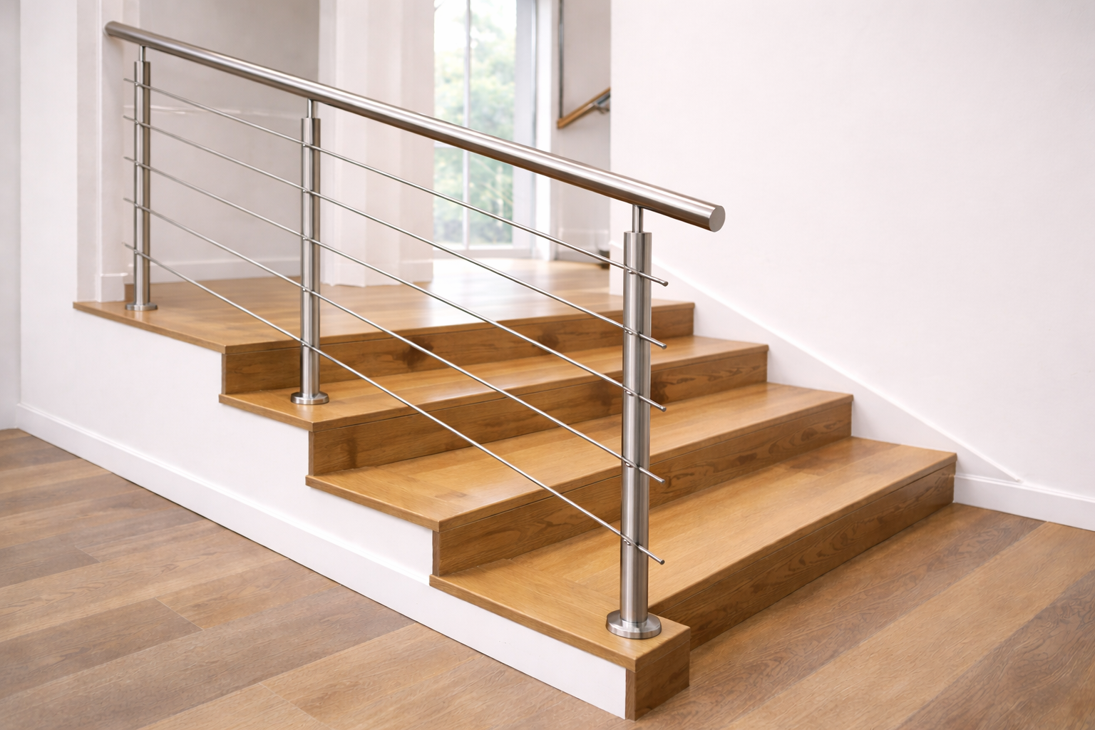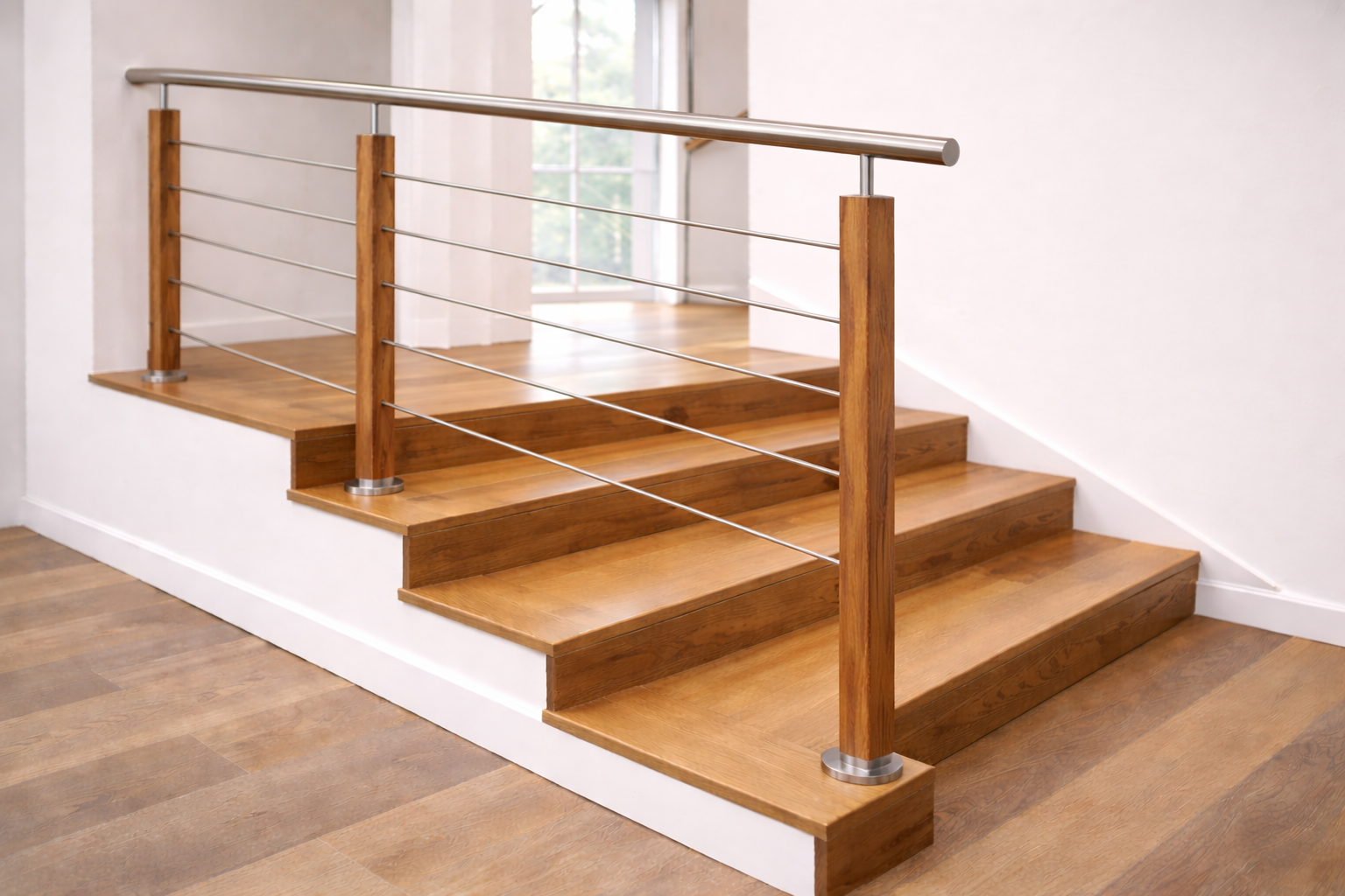 Relinggeländer mit Edelstahl und Holz zeichnen sich durch eine leichte, moderne Optik aus. Waagerechte Elemente und stabile Pfosten sorgen für Sicherheit, ohne das Treppenhaus optisch zu beschweren.